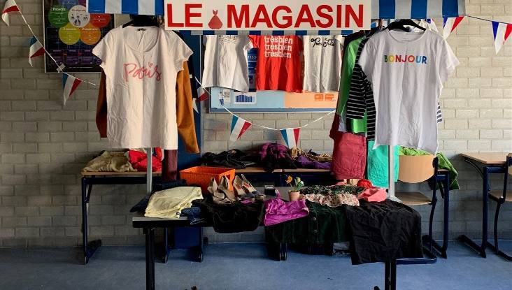 En dan ook nog een vernieuwde versie! In de nieuwe boutique de souvenirs et cadeaux/the souvenir shop waren de leerlingen zo gecharmeerd van alle leuke souvenirtjes dat ze deze eigenlijk ook wel echt hadden willen kopen! Dit jaar gebruikten we (nagemaakte) pinautomaten en werd er ook gevraagd naar de vegetarische afdeling. Ook kregen de klanten geen plastic tasje meer. Nee, die tijd is echt voorbij!