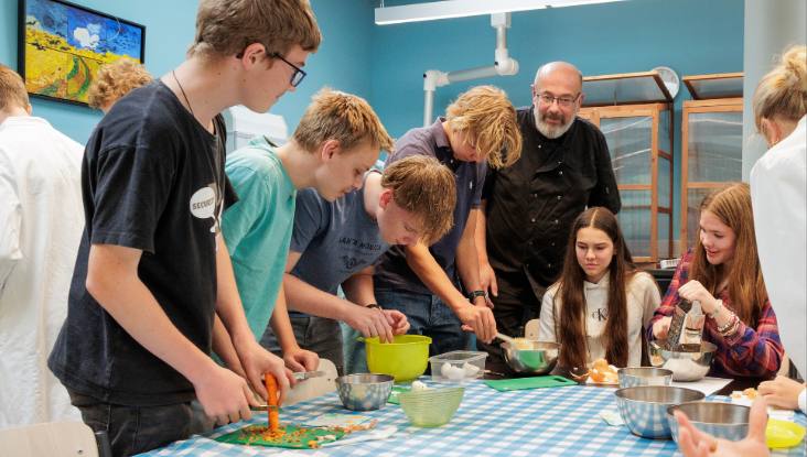 Tijdens een speciale masterclass "Werken met restvoedsel" leerden de 24 NLT (Natuur, Leven en Techniek) leerlingen uit vwo 5 hoe je van overgebleven producten in korte tijd verrassende én smakelijke gerechten kunt maken. Onder leiding van chef-kok Giel Dons gingen de leerlingen zelf aan de slag. Het resultaat: een mini do it yourself-‘burger’, gemaakt van resten brood, rijst, kaas en groenten, met een door de kok bereide kimchi-mayonaise.