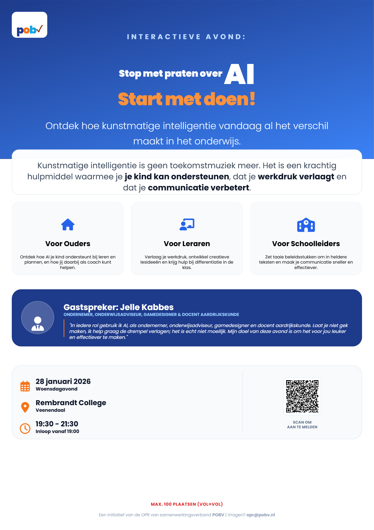 Deze avond wordt georganiseerd in samenwerking met acht voortgezetonderwijsscholen uit onze regio. Meld u zich wel even aan, want er zijn maar 100 plaatsen beschikbaar.